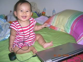 Trông ghét nhỉ???Con gái em thì chỉ thích đóng sập laptop của mẹ và tranh giành chuột để gặm thôi. Hôm nay, sau khi "chiến thắng' được mẹ thì cháu toe văn toét thế này đây