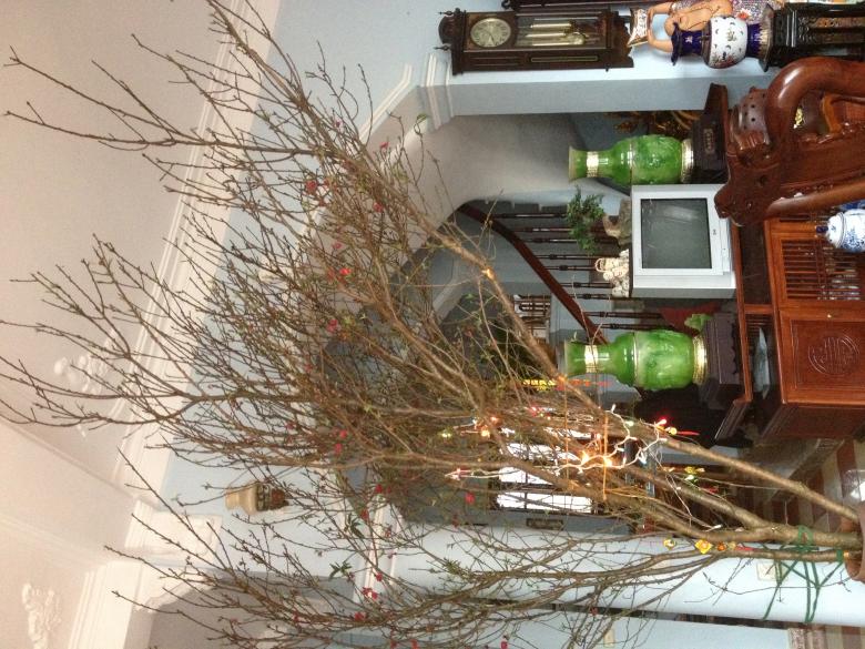 Đào nhà em đây ạ, hí hí, nhiều người ghen tị với mềnh lắm, ai cũng có cơ hội, dưng mà phần thắng nại thuộc về người may mắn hế hế. Cành đào toa ngất ngưởng, hôm qua chồng vác cưa máy ra cưa, 1/3 mang lên nhà cho Ông Tam Đa ngắm, còn lại để góc bể cá ở giếng trời giữa nhà he he. ẢNh này chụp hôm kia lúc cắm xong, hôm nay nở đẹp, lộc vươn dưng ém ảnh hí hí.